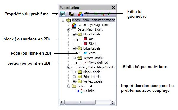 In the "Problem" view, you can edit the main options, as well as material properties, source fields and boundary conditions. The hierarchy shows the file names referenced by the issue. The data and libraries contain the list of names assigned to blocks ( blocks ), segments ( edges ) and points ( vertices ). The blocks, segments and points also define the geometry of the problem.