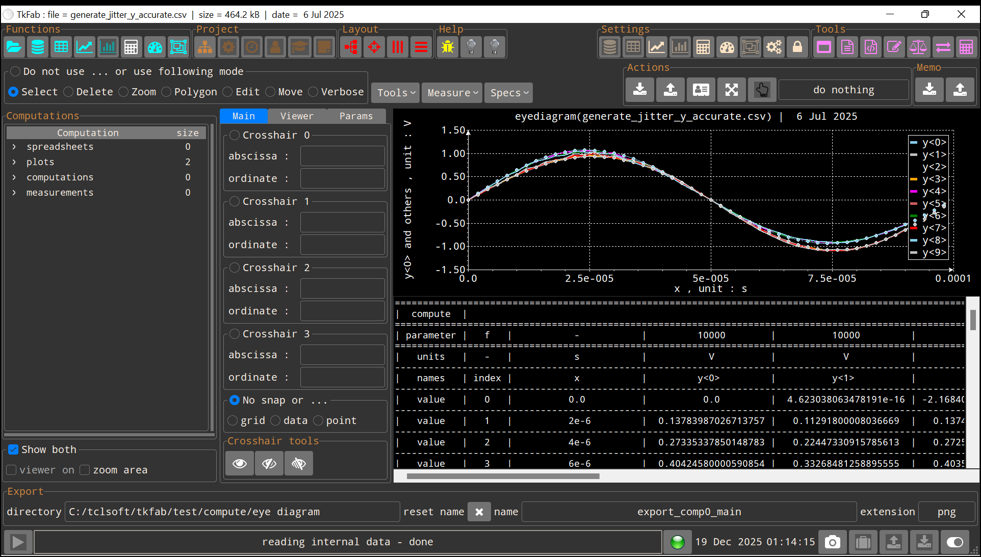 Daten sind gleichzeitig in Form von Texten (Tabellen) und Grafiken (2D-Diagrammen) sichtbar. Eine Hemmung der Synchronität (also wenn eine Modifikation beider Aspekte gleichzeitig erfolgt) ist beim Eingabelesen nicht möglich. "Calculations" oder "Measurements" bleiben immer unabhängig.