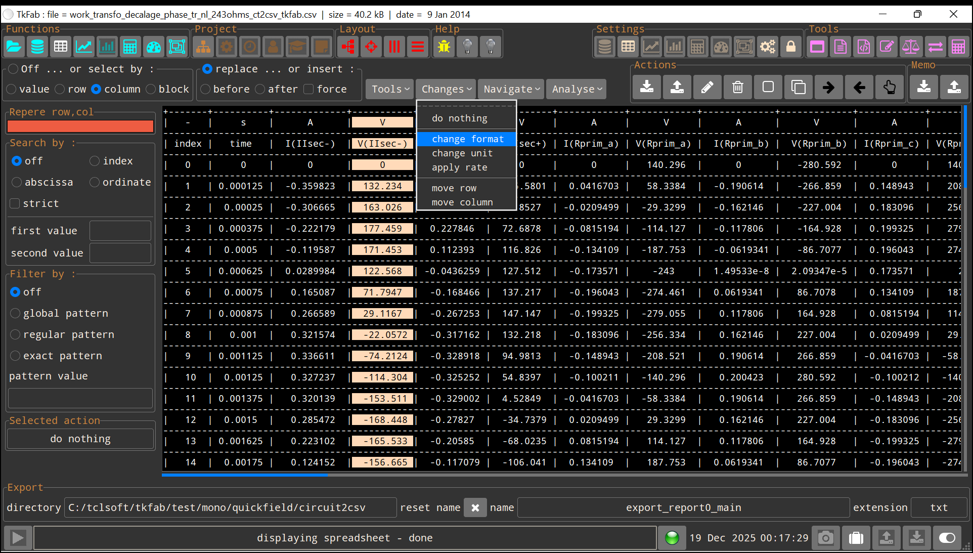 TkFab™ ist eine Software, deren Ziel die einfache Behandlung von Daten ( CSV - und TSV -Format) aus technischer Software oder sogar Tabellenkalkulationen ist. Es ist portabel, im Gegenzug dafür, daß es (noch) nicht in der Lage ist, große Datendateien zu verarbeiten. TkFab™ kann mehrere Dateien gleichzeitig verarbeiten, beispielsweise das Format ändern oder Datenwerte filtern.